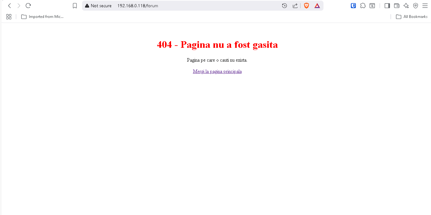 In cazul in care gresim linkul si incercam sa accesam o pagina care nu exista se va afisa o pagina de eroare: