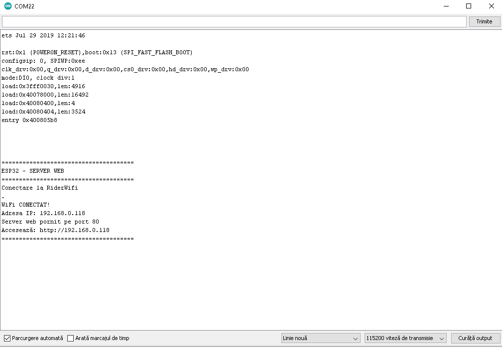 In functie de adresa ip locala adresa ip a serverului poate sa difere. In acest caz adresa de conectare este urmatoarea: 192.168.0.118, asa cum reiese din terminalul serial.